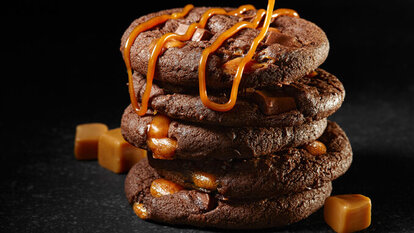 Pecan caramel chocolate candies are reconstructed in this fancy and decadent confection: toasted pecans enrobed in a caramel-chocolate filling are coated in dark chocolate and accented with flaky Diamond Crystal® Salt.Ingredients | Salted Caramel Brownie Cookies½ cup chopped pecans½ cup granulated sugar6 tablespoons heavy cream9 (1 ounce) squares semi-sweet baking chocolate, divided⅛ teaspoon Diamond Crystal® Kosher Salt or Coarse Sea Salt½ teaspoon vanilla extractDirectionsToast pecans in a dry skillet over medium heat until golden and fragrant, about 1 minute. Set aside to cool.Heat sugar over medium-high heat in a heavy pan or Dutch oven, stirring constantly. When sugar begins to melt, stir and cook until sugar turns a rich golden color. If color is too light, caramel flavor will be too faint.Remove caramelized sugar from heat; stir in cream. Return to heat and reduce heat to low. Cook and stir until caramel is well-dissolved into the cream. Remove from heat and stir in salt, vanilla, and half of the chocolate. Stir until chocolate has melted. Stir in toasted pecan bits.Transfer mixture to a bowl and cool slightly. Cover and refrigerate until set, about an hour.Form/roll into 24 small balls, about 3/4- to 1-inch, and arrange on a parchment-lined baking sheet. Chill 1 hour.Place the remaining chocolate in a microwave-safe bowl; microwave on High for about 15 seconds; stir; continue to microwave in 15-second intervals until chocolate is melted.Using a fork, roll the balls in the melted chocolate and place back on the parchment-lined bake sheet. Quickly sprinkle truffles with a few grains of Diamond Crystal® Kosher Salt or Coarse Sea Salt. Chill to set, about an hour.Info | Salted Caramel Brownie Cookiesprep: